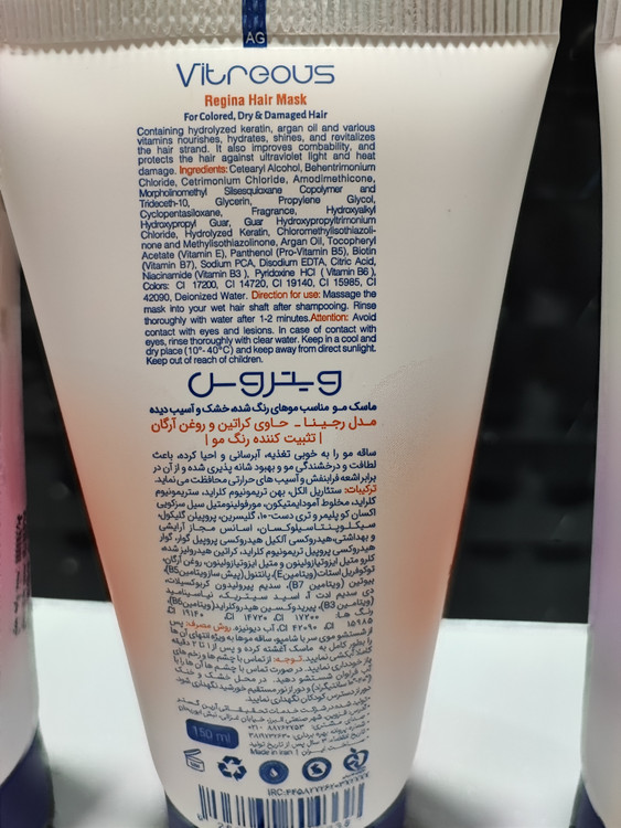 ماسک مو رجینا ویتروس مناسب موهای رنگ شده خشک و آسیب دیده با داشتن ترکیبات موثر حاوی کراتین و روغن آرگان به تقویت، تثبیت رنگ مو، حالت دهی و بهبود شانه پذیری مو کمک میکند تا موهایی زیبا و سالم داشته باشید.