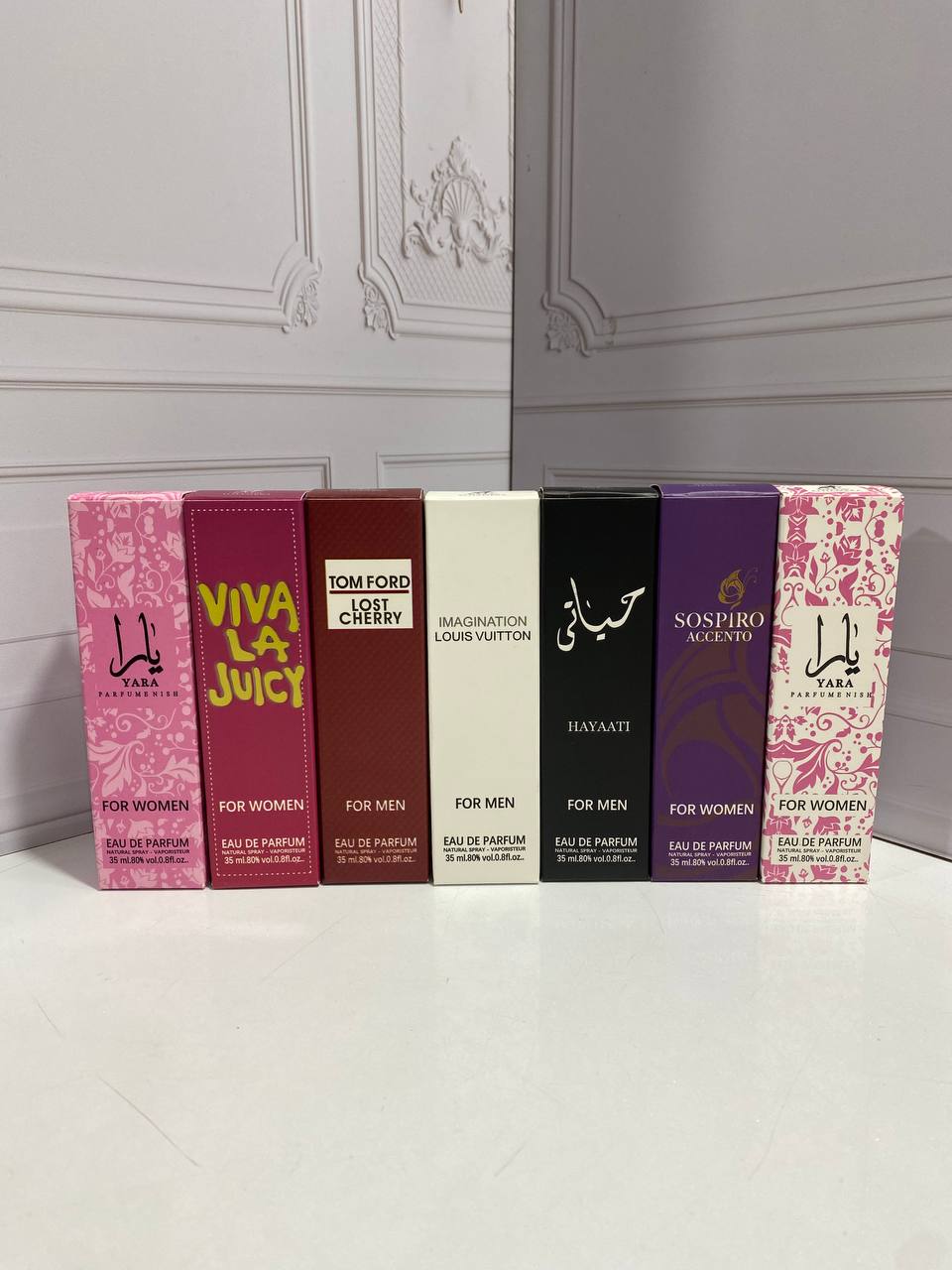 پک شامل ۷ ادکلن با رایحه های ویولا جویسی یارا سفید یارا صورتی تام فورد لاست چری لویی ویتون حیاتی سوسپیرو اسنتو