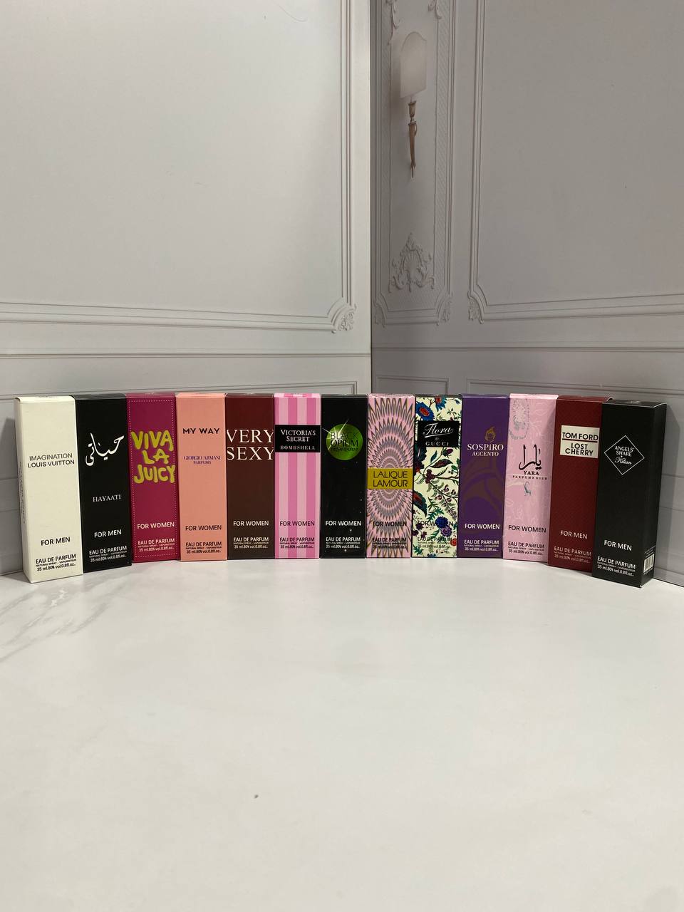 پک شامل ۷ ادکلن با رایحه های ویولا جویسی مای وی ۲۱۲ سکسی ویکتوریا سکرت بلک اوپیوم گوچی لالیک لامور یارا صورتی تام فورد لاست چری لویی ویتون حیاتی سوسپیرو اسنتو آنجلز شیر