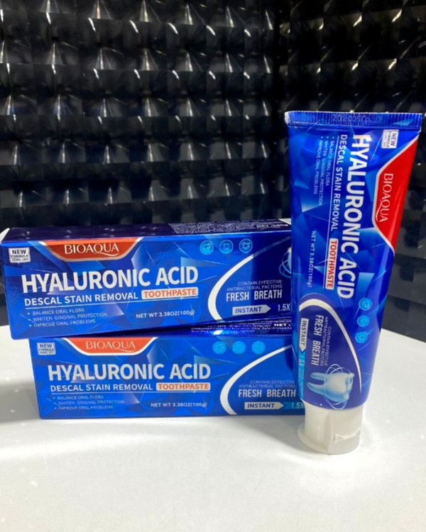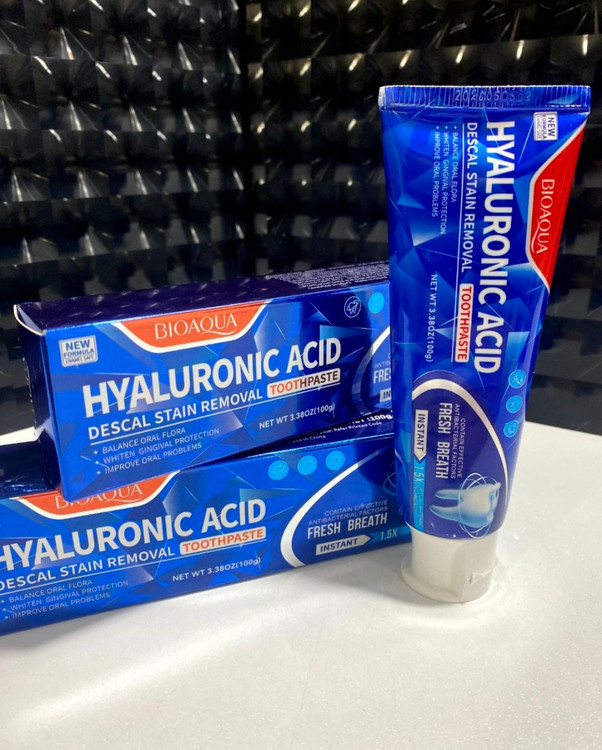 خمیر دندان سفید کننده بیوآکوا حاوی هیالورونیک اسید از بین برنده جرم دندان است. این خمیردندان با اثر سفید کنندگی قوی لک های تیره، زرد و پلاک های دندانی را از بین می برد و موجب روشن و درخشان شدن رنگ دندان ها می شود. همچنین خوشبو کننده دهان بوده و محیط دهان و تنفس را خوشبو و با طراوت می کند.